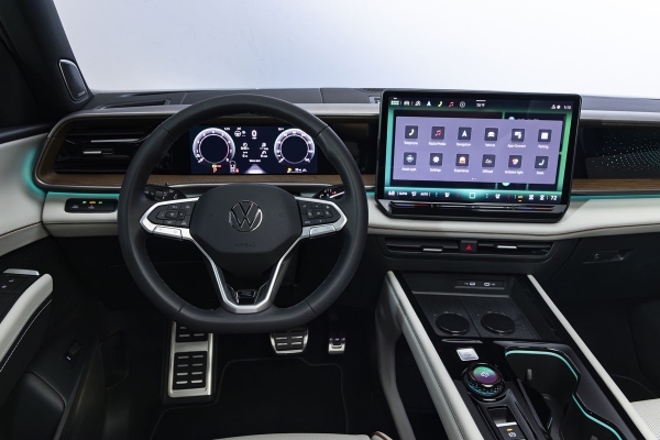 Интерьер Атласа практически полностью заимствован у китайского Teramont Pro, но с небольшими упрощениями. Приборная панель выполнена в виде широкого трапециевидного модуля с 10,25-дюймовым щитком Digital Cockpit Pro и 15-дюймовым тачскрином медиасистемы (в базовой версии — 12,9 дюйма). В отличие от версии для КНР американскому кроссоверу не положен отдельный экран для переднего пассажира — его место занимает опциональная декоративная панель со светодиодным рисунком, являющаяся частью контурной подсветки машины. В начальных версиях ей доступно 10 цветов, в топовых — до 30.