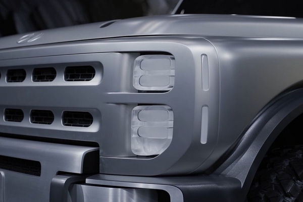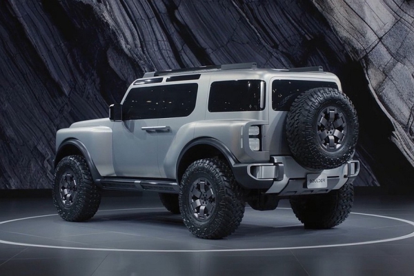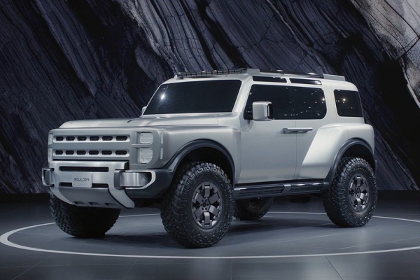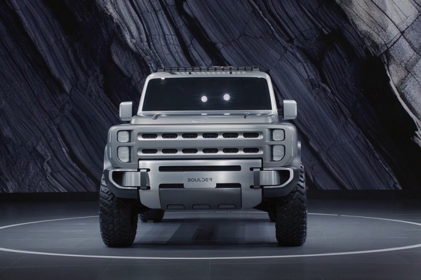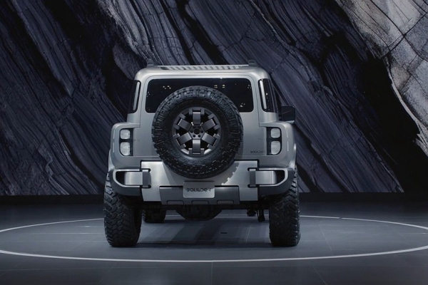 В верхней части дверей есть дополнительные окошки. Распашная багажная дверь с наружной запаской – с «двойными петлями», то есть открывается она в обе стороны. Заднее стекло можно опустить. Наконец, Boulder имеет 37-дюймовые шины. А вот размеры внедорожника компания не раскрыла.