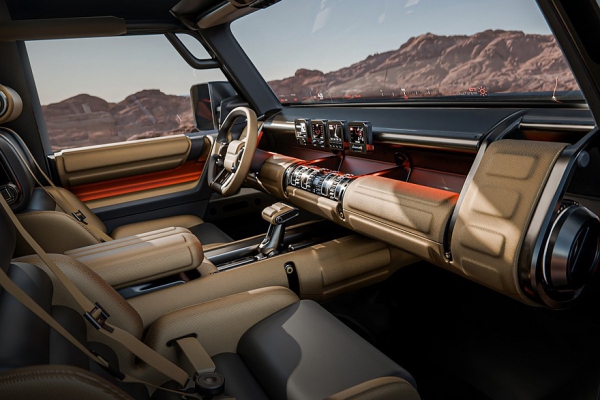 Интерьер пока продемонстрировали лишь на картинках — не живьем. Для вездехода предусмотрены проекционный дисплей во всю ширину лобового стекла, четыре небольших экрана по центру передней панели, массивный селектор коробки и множество физических клавиш. Еще обещаны «уникальные раскладные столики», но на изображениях их не видать.