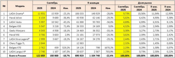 В ТОП-10 бестселлеров среди моделей все так же лидирует семейство Lada Granta (11 931 шт.). Второе место занял кроссовер Haval Jolion (6154 шт.), причем он второй месяц подряд обходит Lada Vesta (5997 шт.), у которой снова третья позиция. Четвертая строчка в модельном рейтинге досталась компактному паркетнику Belgee X50 (5547 шт.), за ним идет кроссовер Geely Monjaro (4043 шт.).