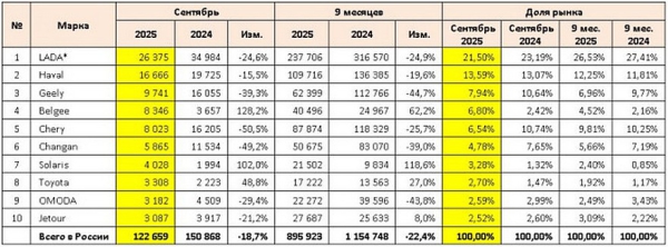 Как и в августе, в сентябрьский ТОП-10 брендов также вошла Toyota (3308 шт., 8 место), хотя официально японская компания свои автомобили в РФ не поставляет. Еще любопытно то, что Тойота — одна из трех марок, которые продемонстрировали «плюс». Две другие в первой десятке – Belgee и Solaris.