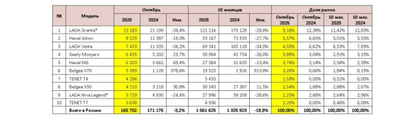 Топ-10 моделей на рынке новых легковых автомобилей в октябре 2025 года (шт.)