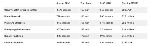 Совершенно стандартный Corvette ZR1X в базовой комплектации на стандартных шинах Michelin Pilot Sport 4 S и заправленный обычным бензином смог проехать четверть мили (402 м) всего за 8,675 с, показав на выходе скорость 256 км/ч, а разгон до 60 миль/ч (96,56 км/ч) занял всего 1,68 с. Но есть нюанс: эти значения были достигнуты на подготовленной поверхности, обеспечивающей наилучшее сцепление с шинами. Вместе с этой оговоркой пресс-служба GM включила Corvette ZR1X вот в такую сравнительную таблицу: