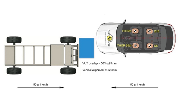 Фронтальный удар о стену на скорости 50 км/ч заменён фронтальным ударом о деформируемый барьер на скорости 35 км/ч — эксперты Euro NCAP считают, что этот тест точнее отражает реальность, то есть наиболее часто случающиеся аварии. В этом тесте за рулём будет сидеть женщина пятого перцентиля, на месте переднего пассажира — мужчина пятидесятого перцентиля, за ним во втором ряду — ещё одна женщина пятого перцентиля. Этот же фронтальный удар о деформируемый барьер будет воспроизведён виртуально на скоростях 50 и 56 км/ч, причём с разными манекенами (пятого, пятидесятого и девяносто пятого перцентилей). Таким образом Euro NCAP хочет учесть влияние размеров и массы тела на результаты теста.