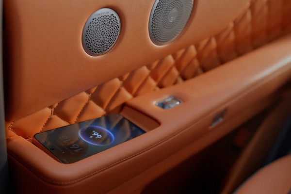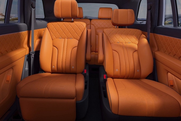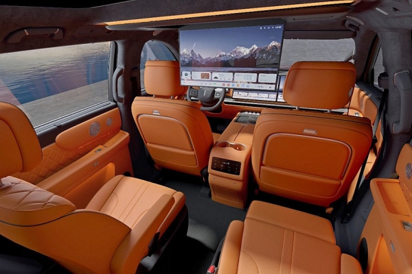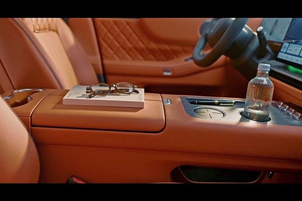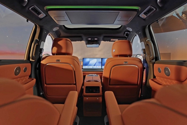 В торце тоннеля – сенсорный пульт для управления всевозможными настройками. У расположенного во втором ряду правого сиденья есть откидная подставка для ног. А в спинки передних кресел встроены столики. Разумеется, кресла также имеют подогрев, вентиляцию и массажер, плюс динамики в подголовниках. Наконец, для задних седоков предусмотрен отдельный крупный экран – как водится, он прикреплен к потолку.