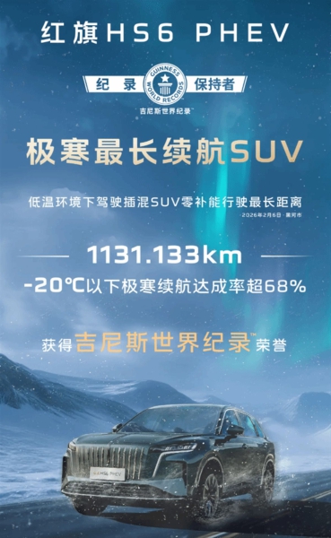 Гибридный кроссовер Hongqi HS6 дебютировал в сентябре 2025 года, а уже в ноябре попал в Книгу рекордов Гиннесса. Тогда он преодолел без подзарядки и дозаправки 2327,343 км. Теперь модель снова побила рекорд по запасу хода, но уже в холодных зимних условиях.
