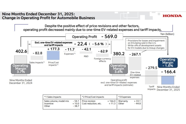 Компания Honda опубликовала отчет за третий квартал своего финансового года (он у японцев заканчивается 31 марта), в котором сообщила о непростом положении автомобильного бизнеса. За девять месяцев отчётного периода операционная прибыль автогиганта ушла в минус на 166,4 млрд иен (1,09 млрд долларов), хотя годом ранее зафиксирован доход в размере 402,6 млрд иен (2,6 млрд долларов). Главными причинами падения стали заработавшие в минувшем году новые ввозные пошлины США (на них потратили 279,5 млрд иен — 1,8 млрд долларов), а также провальные проекты электромобилей — они вытянули из японцев ещё 267,1 млрд иен (1,7 млрд долларов).