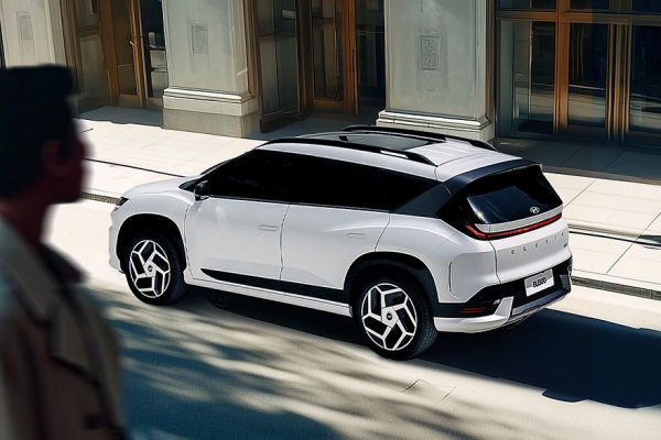 Паркетник имеет раздельные фары, под которыми расположена пиксельная полоска, выполняющая роль дневных ходовых огней. Пиксельной сделали и плашку задних фонарей. Hyundai EO также получил выдвижные ручки дверей, задние стойки кузова оформили в виде «плавников», переходящих в спойлер на багажной двери. Для модели предусмотрены 18- или 20-дюймовые диски.