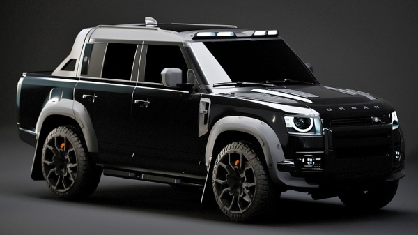 Чёрный пикап на базе Defender 130 — это уже вариант от британского тюнинг-ателе Urban Automotive, которое вместе с Heritage Customs входит в состав холдинга AM Group. Этот холдинг, корни которого находятся в Нидерландах, специализируется на различных видах тюнинга. Конкретно Urban Automotive работает в брутальном стиле, любит чёрный цвет, карбон, большие колёса и рельефные кузовные обвесы.