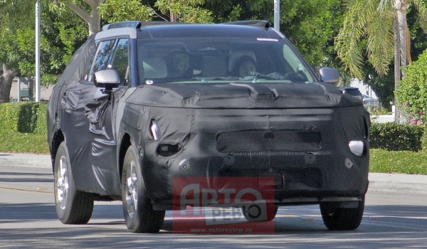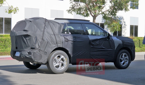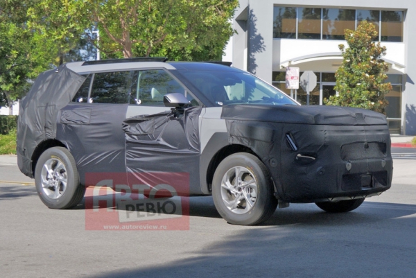 Даже плотный слой камуфляжа не может скрыть кардинально переделанный облик кроссовера. Кузов выполнен в нарочито угловатой и брутальной манере, как у старшей модели Santa Fe пятого поколения. Хотя о прямом масштабировании речи, похоже, нет: конфигурация светотехники будет другой. Передние стойки крыши зачернены, а на крыльях красуется массивная накладка из некрашеного пластика. Корма пока что скрыта под объемной накладкой, так что рассмотреть ее нельзя.