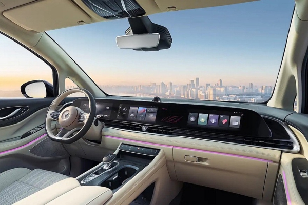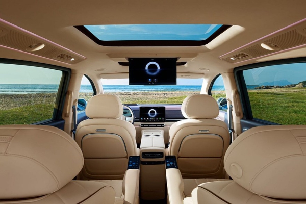В салоне Voyah Dream+ вместо трехэкранного табло установлены отдельные дисплеи приборки и мультимедийной системы. Для пассажиров предусмотрен свой планшет – он прикреплен к потолку. Раздельные кресла второго ряда имеют встроенные в подлокотники пульты, откидные подставки для ног, «расширенные зоны подогрева», вентиляцию и 26-точечную систему массажа. В списке оборудования нашего нового минивэна еще значатся проекционный дисплей и аудиосистема с 22 динамиками.