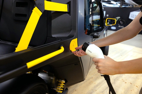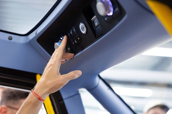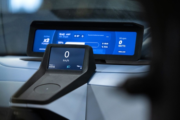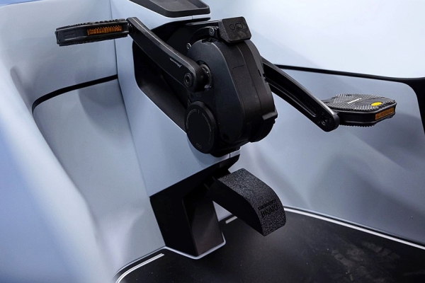 Запас хода на одной зарядке — примерно 160 км, точная цифра будет зависеть в том числе от того, как часто и с каким усилием водитель будет крутить педали. Усилие можно регулировать, так что каждый ездок сможет выбрать комфортную нагрузку. Руль похож на велосипедный и проходит буквально под пятой точкой пилота. Для аварийного тормоза предусмотрена отдельная напольная педаль. Над педальным узлом находятся два приборных экрана. Над лобовым стеклом разместился блок настроечных клавиш и рукояток. В крышу вмонтированы два смотровых окна, обзорность вполне себе аквариумная.