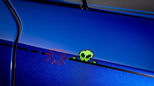Например, кузов автомобиля имеет двухцветную окраску, как у старых игровых автоматов. Основная часть — синий оттенок Salamanca, верх — черный металлик Diamond с мерцающим покрытием Crystal. Двери и передние крылья украшены узором Cheeky Alien (в переводе «нахальный пришелец») с 8-битной графикой. Он нарисован вручную и состоит из 89 отдельных пикселей. Венчают образ черные 22-дюймовые колеса и подсветка решетки радиатора.