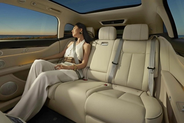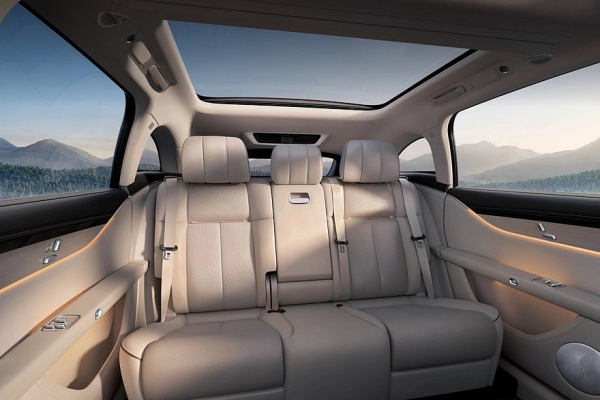 В списке оборудования еще заявлены: трехзонный климат-контроль, подогрев, вентиляция и массажер всех сидений, откидной столик (встроен в спинку переднего кресла) и собственный кинотеатр для задних пассажиров с опускающимся сверху панно.