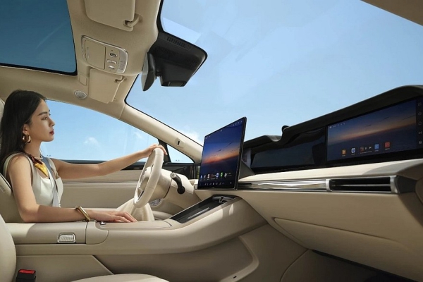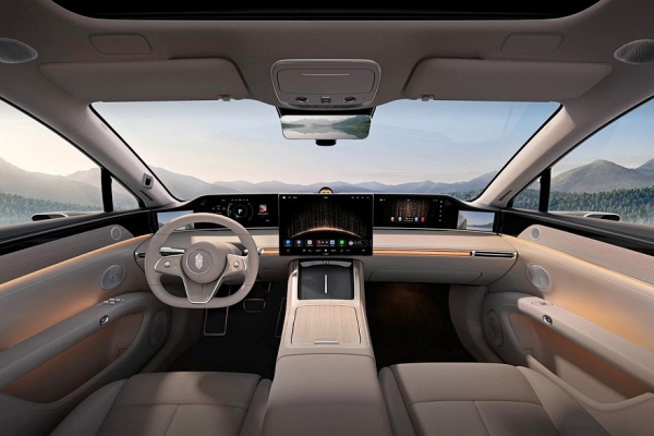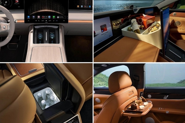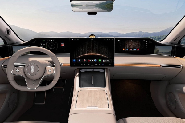 Салон оформлен в едином ключе с седаном. Внутри Stelato S9T – раздельные экраны приборки (12,3 дюйма) и мультимедийной системы (16,1 дюйма). У машин с наружными камерами вместо зеркал по краям передней панели есть дополнительные дисплеи. На центральном тоннеле расположены две площадки для беспроводной зарядки гаджетов, а в сам тоннель встроен бокс с функциями подогрева и охлаждения. Собственная фишка универсала – еще один тачскрин (12,3 дюйма) перед передним пассажиром.