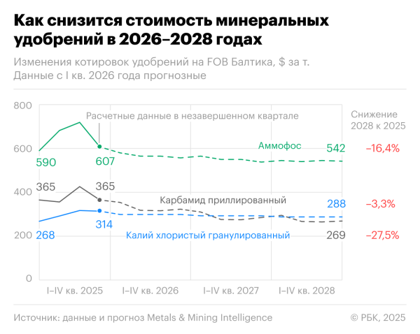 Согласно этим прогнозам, цены на аммофос к концу 2028 года упадут до $542 за тонну, на карбамид приллированный — до $288 за тонну, на калий хлористый гранулированный — до $269 за тонну. О причинах такого возможного падения — в подписке РБК.