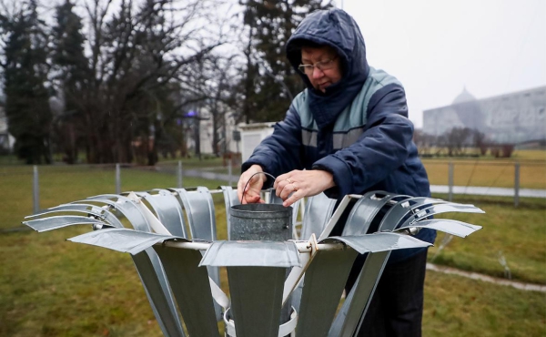 Сотрудница во время проверки осадкомера на метеорологической станции