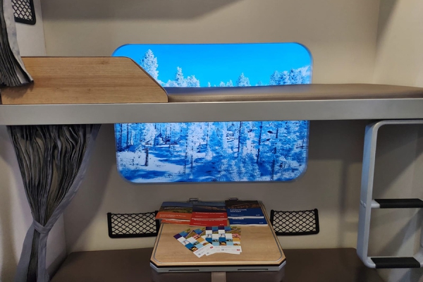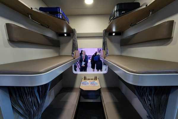 Каждое спальное место оснастили шторками и индивидуальным воздуховодом. Для пассажиров также предусмотрены столики, персональные светильники, розетки — USB и классические на 220 Вольт.