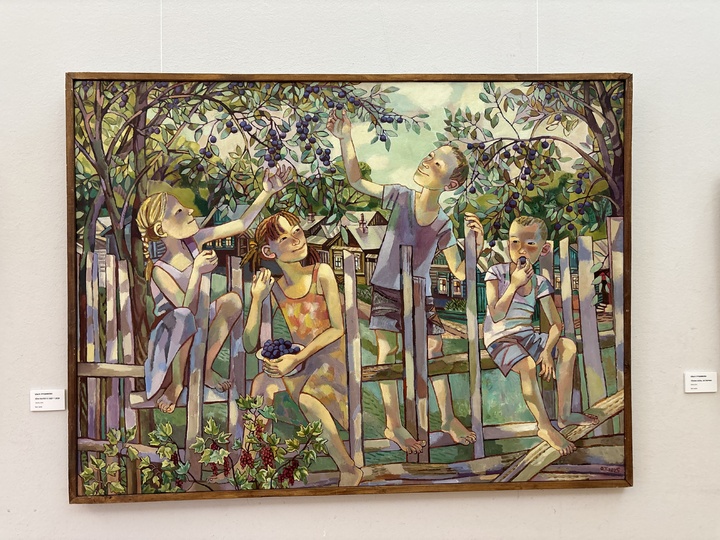 Вообще, у художницы много домашних ностальгических сюжетов, где многие напомнят о детстве и, возможно, у ряда полотен придется и всплакнуть. «Бабушкино варенье» — снова теплые, согревающие тона, девчушка выловила из тазика ягодку, а бабушка ласково глядит на внучку, помешивая будущее варенье, баночку которого наверняка откроют зимой к чаю. «Терн поспел в саду у деда» — лето, ребятишки залезли на забор и добывают сочные ягоды прямо с ветки. Кто так не делал? Есть тут такие?