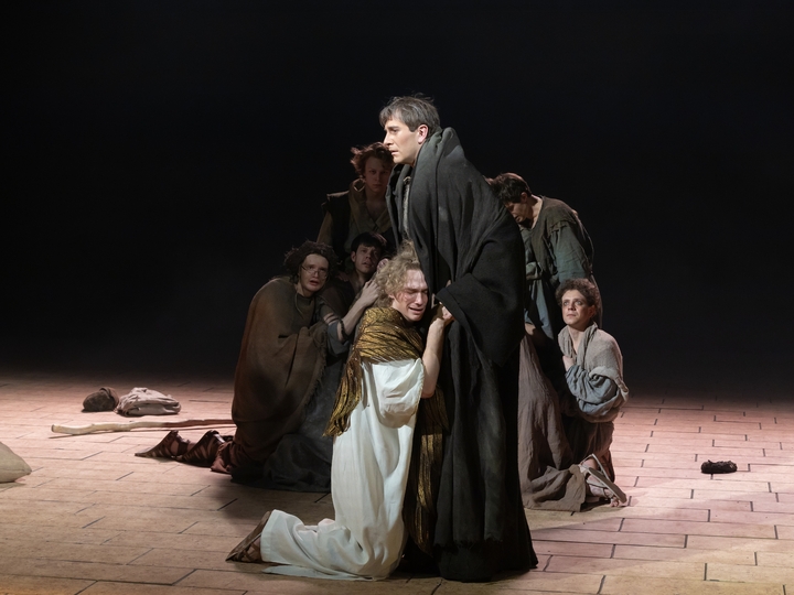 Режиссер перевел прозу немецкого классика, основанную на историях Ветхого и Нового Заветов, в притчу, что во многом соответствует стилистике первоисточника: Иаков, сын Ицхака, родил… и дальше в глубь веков… Явление первого можно рассматривать даже не как пролог, а увертюру спектакля, и слово «увертюра» тут вполне будет уместно: кажется, музыка в спектакле звучит постоянно. Но это обманчивое впечатление.
