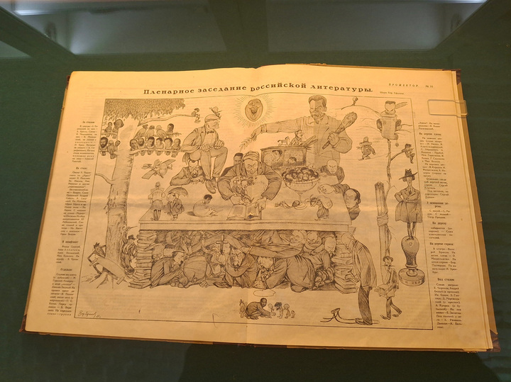 Мало? Получите еще! Карикатурный разворот журнала «Прожектор» изображает «пленарное заседание российской литературы». Горький, как бык, выпускает пар из носа. Лилипут Осип Брик сидит на кепке у Маяковского. Юрий Либединский (автор воспоминаний о Есенине) вылупился из яйца… На дереве на птичьих правах разместился ряд авторов, под ними на аэроплане летит комичный Есенин…