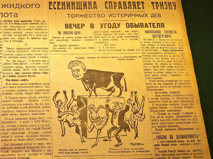 Заголовок весьма показателен. «Есенинщина справляет тризну. Вечер в угоду обывателя». Снова карикатура — Есенин в качестве «золотого тельца». (И это — в годовщину смерти!) Рифмованная подпись: «Москва еще не видела,/Чтоб этак вокруг идола/Плясали в честь «культуры»/Кликушествующие от литературы».