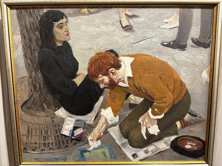 Трагическое полотно Коржева «Художник» — на выставке представлен эскиз к нему, отражающий недоумение от увиденного. «Тротуарный» художник стоит на коленях в прямом смысле — уличный художник сидит на коленях на улице и делает набросок мелками, сюжет, что называется, востребованный — обнаженная девушка, купить должны точно, рядом лежит кепочка — для милостыни, куда прохожие бросают мелочь, случайно завалявшуюся в кармане.