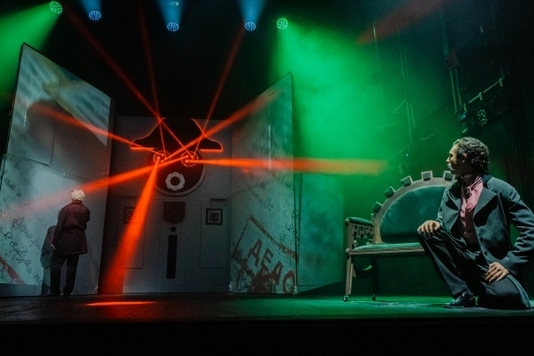 Еще об одной фишке спектакля стоит сказать: Марк Григорьевич обещал недавно написать совместно с нейросетью музыку. По факту в первой премьере сезона ИИ уже активно используется: на фоновый экран, перегораживающий сцену, проецируются облики демонических сущностей, там же «оживляются» отдельные персонажи, Гегель, учением которого увлекается Сухово-Кобылин, плюс упоминаемый в спектакле Михаил Щепкин (игравший в 1855-м году в Малом театре помещика Муромского из «Свадьбы Кречинского»).