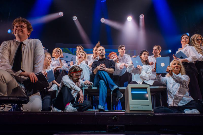 Два Стива — Возняк (Василий Рахманин, слева в углу) и Джобс (Богдан Ханин), первый домашний ПК и «парад айпадов». Фото: Предоставлено театром «У Никитских ворот»