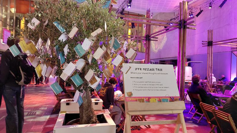 В фестивальном центре, куда приходят и зрители, и профессионалы, и где располагаются три кинозала, установили кадку с оливковым деревом. Любой желающий может написать свои пожелания на открытке и повесить ее на дерево. Рядом находится стенд с разноцветными открытками трех видов с тремя разными вопросами в помощь экспертам из народа и мира кино. Олива стала своего рода книгой жалоб и предложений.