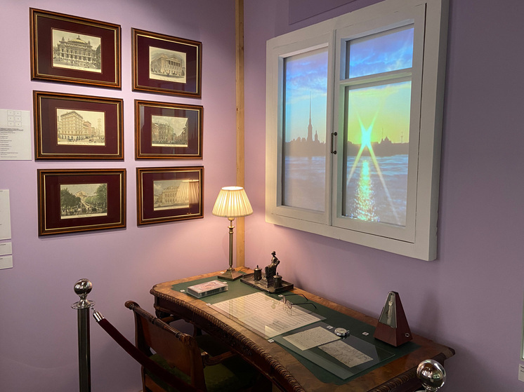 Открываем глаза, заходим в выставочное пространство и попадаем в кабинет композитора: здесь его восстановили. Из окна видны Петропавловская крепость, Нева — солнечный Петербург. На столе все просто и скромно: метроном, чернильный прибор, настольная лампа, очки, словно оставленные композитором после трудового дня… Работал он, судя по оставленной на столе рукописи, над оперой-феерией «Маяковский начинается». Нас пустили в интимное, личное пространство композитора: здесь же и письмо Андрея Павловича отцу от 1949 года, подпись «Твой сын Адя» — так его ласково называли домашние.