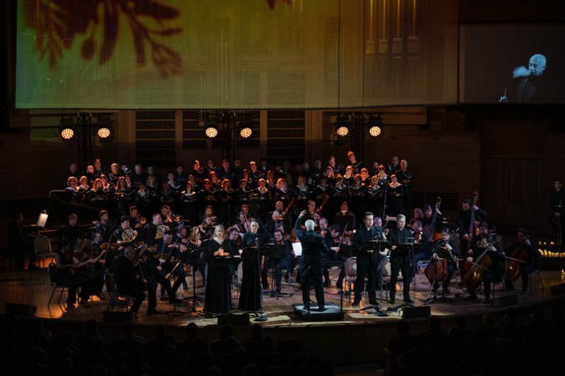 Надо сказать, что пусть и концертное исполнение сочинения подразумевает, что вечер будет вовсе не светский, а духовный. Атмосфера таинства — приглушенный свет, абсолютная тишина в зале. Но еще до начала музыкальной части началась мультимедийная составляющая: над сценой Светлановского зала непривычно нависали три белых экрана, на самом большом, центральном, цитируют предисловие из вышедшего в 1801 году издания ораториальной версии произведения, написанное самим Йозефом Гайдном. Композитор рассказывает, как один каноник из Кадиса обратился к нему с необычной просьбой сочинить инструментальную музыку на семь слов Иисуса на кресте (семь слов — небольшие фразы, которые Христос произносил на кресте).