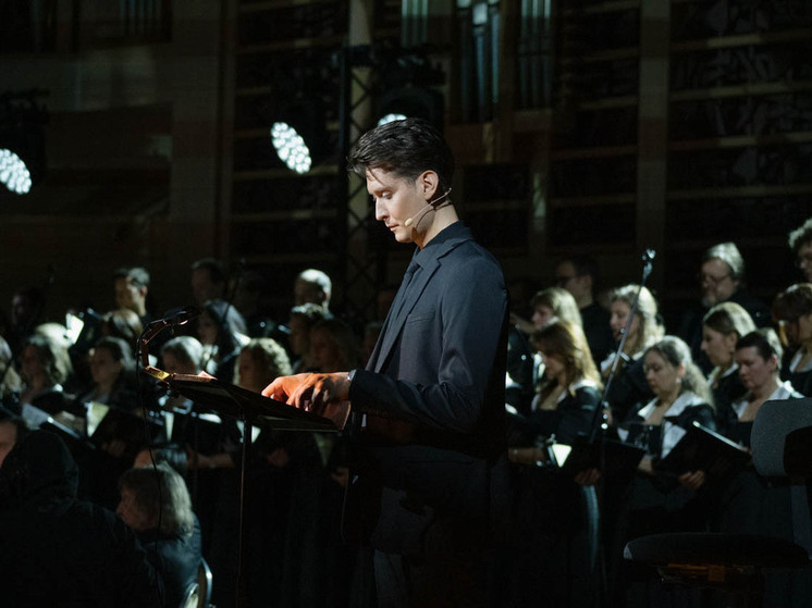 Примерно тот же эффект воспроизвели с помощью еще двух экранов по бокам. На сцене чтеца не было видно, но его лицо крупным планом в черно-белом варианте выводили на экран — вот еще один нюанс, воссоздающий атмосферу храма и всеобщей молитвы. Перед нами словно появляется епископ, которого описывал композитор, а затем появляется и второй «священник» — музыкальный, в роли которого выступал маэстро Владимир Спиваков. Его такой же крупный портрет сменял чтеца и мы в прямом эфире видели лицо дирижера, что непривычно, потому что обычно-то мы видим его со спины, а тем слушателям, кто сидит с краю, доступен кусочек его лица. «Кино», где в главной роли оказался дирижер, получилось захватывающим, и даже завораживающим: композитор создал медленную музыку, требующую, однако, огромного напряжения от «музыкального епископа». Трансляция работы дирижера на боковых экранах — зрелище довольно «залипательное», впечатление разговора не с оркестром и хором, как это обычно бывает, а со слушателем.