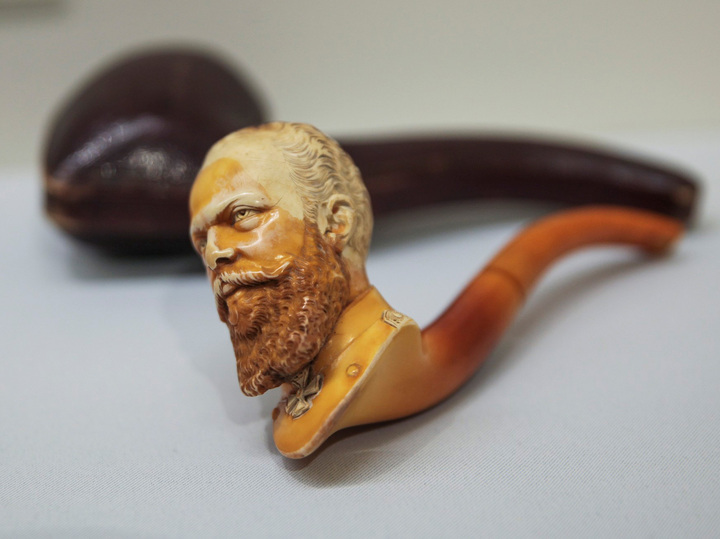 На стенде с янтарем чего только нет: шкатулки, предметы личного обихода, но самое интересное — янтарная трубка с изображением Александра III. Император был страстным курильщиком вместе с красавицей супругой Марией Федоровной, и у них была довольно большая коллекция курительных трубок. Интересно, если закурить такую трубку, то дым будет идти, получается, прямо из головы императора (задымится от дел государственных…)?