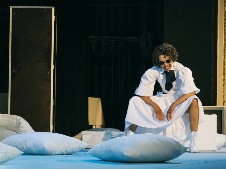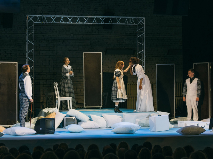 По сцене разбросаны белоснежные подушки, вполне пригодные для модного современного дома. И чемодан здесь белый, и скатерть на большом семейном столе. Словом, стиль почти дизайнерский.