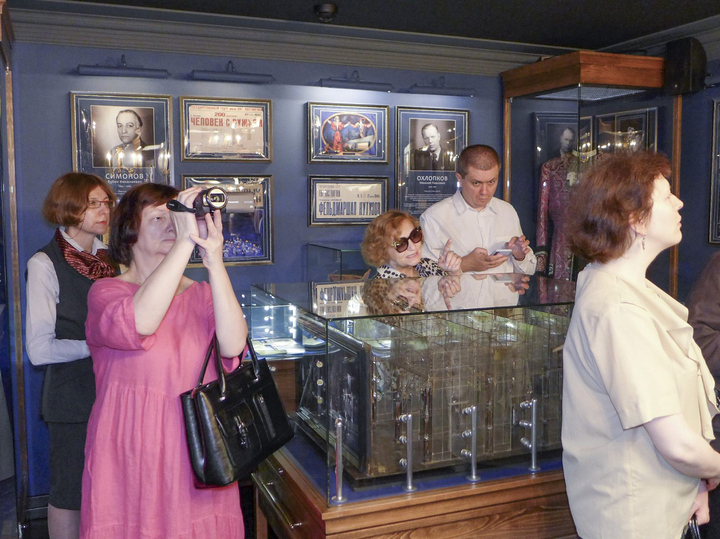 В центре «мягкой карусели» установлена старинная статуя, доставшаяся музею, как рассказал директор Кирилл Крок, со времен бывшего владельца театрального особняка Берга — именно она выступает в роли «экскурсовода». Стены — экран, на котором смотришь объемный видеоролик, как в планетарии: история театра в сюжете отсчитывается от стрелецких казарм, которые стояли на этом месте в старой Москве XVI века. Правда, стены оказываются створчатыми, их «распахивают», и, о чудо, внутри все заполнено экспонатами… продолжающими рассказ. И о событиях послевоенных десятилетий мы узнаем от имени говорящего с немецким акцентом осколка фугасной бомбы, сброшенной фашистами и погубившей в ночь с 23 на 24 июля 1941 года двух артистов и работника театра.