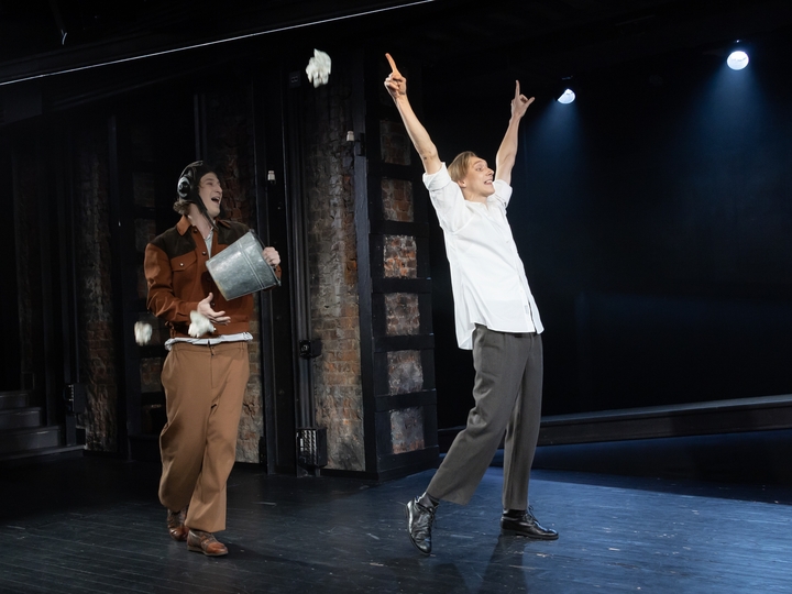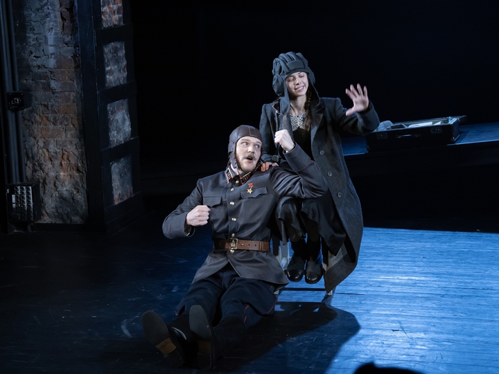 Реалистическая, правдивая проза решена Анатолием предельно правдиво… условными средствами. И в оформлении, и в какой-то степени актерским существованием. Собственно, кроме пары диагональных плоскостей и пары табуреток на сцене ничего нет. Но отчего-то верится, что здесь есть школа и выпускной, техническая лаборатория Дворца пионеров, поле боя, комнаты в коммуналках, каток «Динамо». Здесь взрослеют Сережа (Егор Разливанов), одержимый идеями электротехники, задиристая Танька, увлекающаяся натура, не способная сосредоточиться на чем-то одном, обаятельная отличница Люська (Марфа Пашкова) и веселый такой Володька (Григорий Здоров), в равной степени подсевший на реинкарнацию и ракетные двигатели.