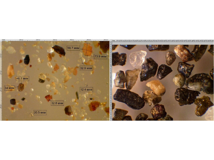 Сравнительные микроскопические изображения образца 1 (частицы силикатного песка, слева) и образца 2 (частицы магнетитового песка, справа). Фото: https://pubs.aip.org/aip/adv/article/15/9/095034/3364506