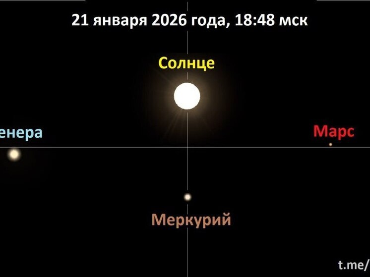В среду, 21 января, в Лаборатории солнечной астрономии ждут нового перестроения, теперь уже трех планет со светилом. По информации наблюдателей, в 18:48 по московскому времени Солнце, Марс, Венера и Меркурий выстроятся (при взгляде с Земли) так, что образуют нечто вроде правильного ромба (или крестообразного соединения). «Меркурий соединится с Солнцем на небе по долготе на расстоянии около 2 градусов. Марс и Венера в свою очередь сформируют горизонтальную ось образовавшегося крестообразного соединения на расстоянии около 3 градусов от Солнца, – говорится в телеграм-канале Лаборатории. – В такой конфигурации небесные тела будут наблюдаться около суток».