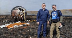 СПУСКАЕМЫЙ АППАРАТ «БИОНА-М»№2 НА ЗЕМЛЕ. ЕГО ВСТРЕТИЛИ ДИРЕКТОР ИМБП РАН ОЛЕГ ОРЛОВ И ПРЕДСТАВИТЕЛЬ ПРЕСС-СЛУЖБЫ ИНСТИТУТА ОЛЕГ ВОЛОШИН. СНИМОК ПРЕДОСТАВЛЕН ИМБП РАН. АВТОР ОЛЕГ ВОЛОШИН