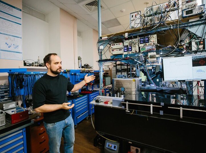 Илья Семериков демонстрирует самый мощный на сегодняшний день 50-кубитный ионный квантовый компьютер. Фото Научная Россия. Ольга Мерзлякова.