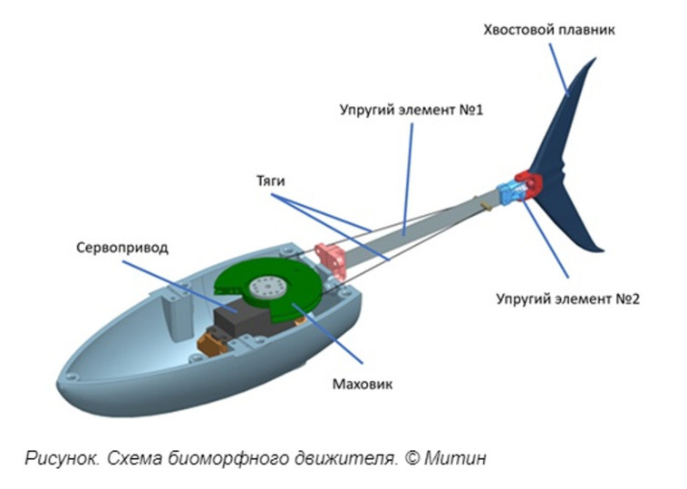 Основным механическим движителем является хвостовой плавник «рыбы», прикрепленный к гибкой пластине, и сервопривод (электрический привод с обратной связью), закрепленный на корпусе. По обеим сторонам пластины расположены тяги из металлических тросиков. При вращении сервопривода они попеременно деформируют гибкую пластину. Такой механизм позволяет реализовать ровное и плавное волнообразное движение хвоста.