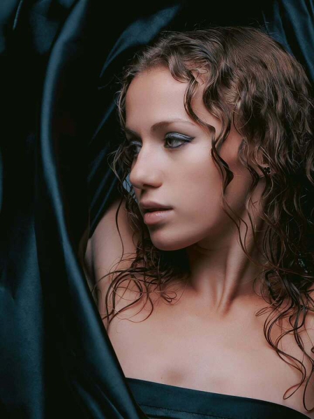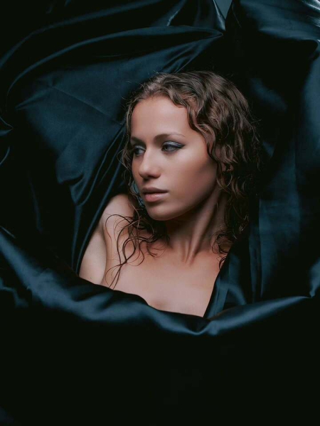 Елизавета не стала долго раздумывать над нарядом. Она обошлась без одежды, задрапировав обнаженное тело складками тяжелого темно-синего шелка. Фотографии получились чувственными и немного таинственными.