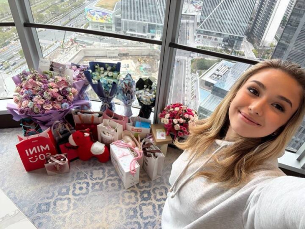 Разместившись в отеле, Валиева сфотографировалась с презентами от поклонников на фоне шанхайских видов. Спортсменка, одетая в светло-серое худи, улыбнулась на камеру.