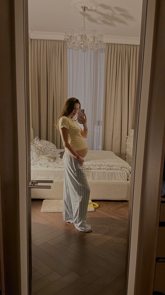 Луконина опубликовала фото, сделанное в профиль. Будущая мамочка сняла на телефон свое отражение в зеркале. На Яне домашний костюм, состоящий из желтой футболки и пижамных брюк в полоску. Спортсменка спустила резинку штанов и приподняла край футболки, показав округлившийся живот.