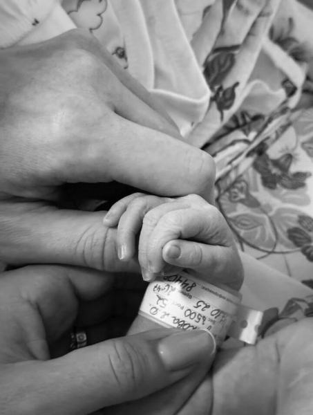 На страничке Сизиковой появилось черно-белая фотография, сделанная в роддоме. Родители бережно и нежно держат маленькую ручку младенца. На бирке, надетой на запястье новорожденной, написаны ее параметры.